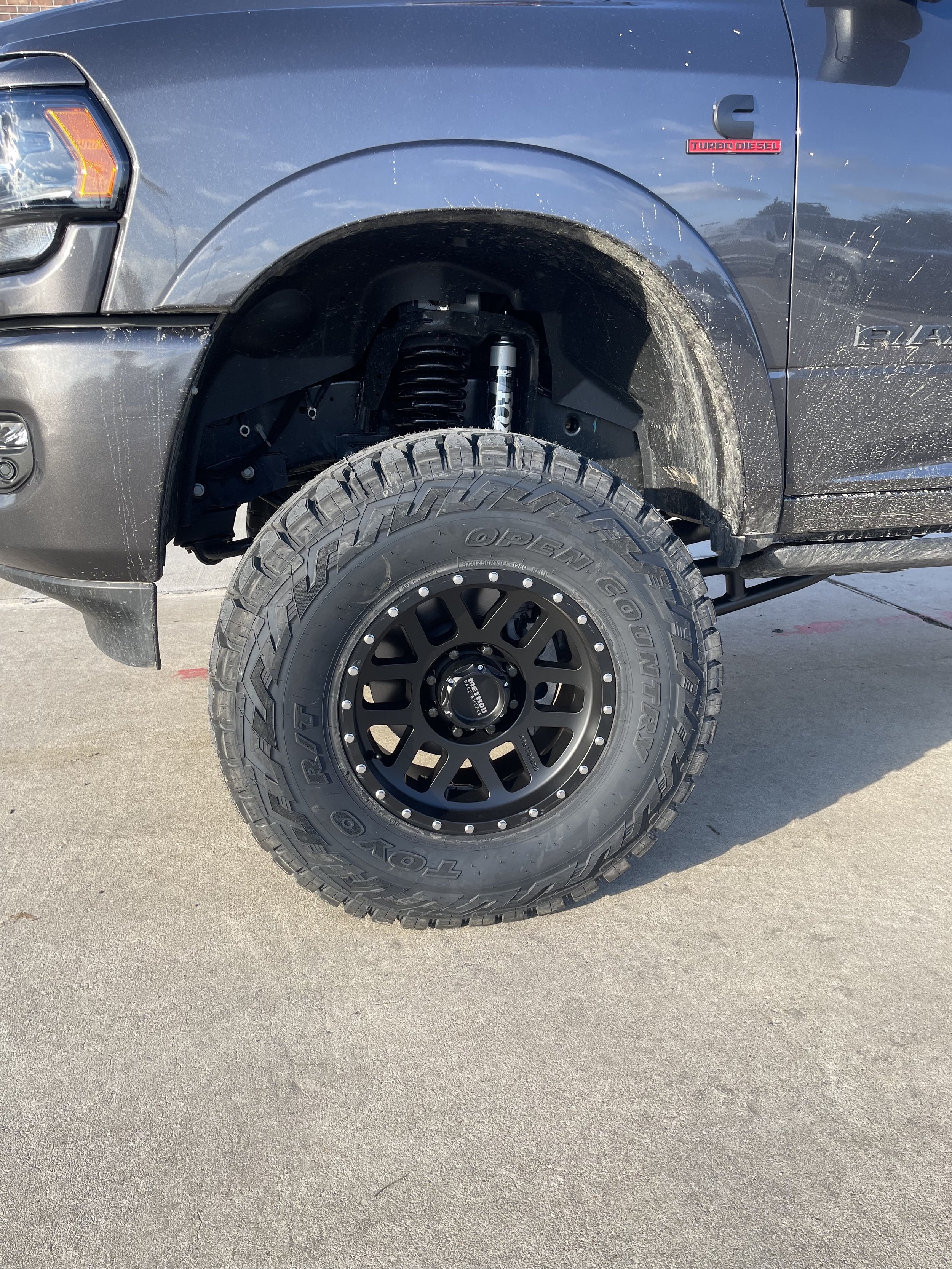 BDS 4” radius arm lift kit w/ Fox shocks and Fox dual steering stabilizer, Fuel Maverick 18X9, Toyo Open Country A/T3 LT37/12.50R8/10, Retrax Pro MX, B&W Tow & Stow 7” drop w/ 2.5” shank on 2021 Ram 2500